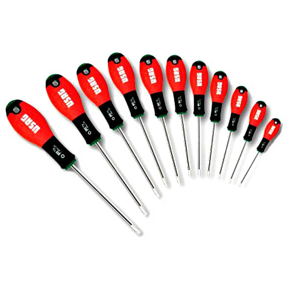 Serie 11 cacciaviti TorxImpugnatura ergonomica bimaterialeLama acciaio Cromo VanadioEsecuzione cromata con punta sabbiataComposizione:6x50-7x50-8x50-9x50-10x75-15x75-20x10025x100-27x100-30x125-40x150 Per saperne di più