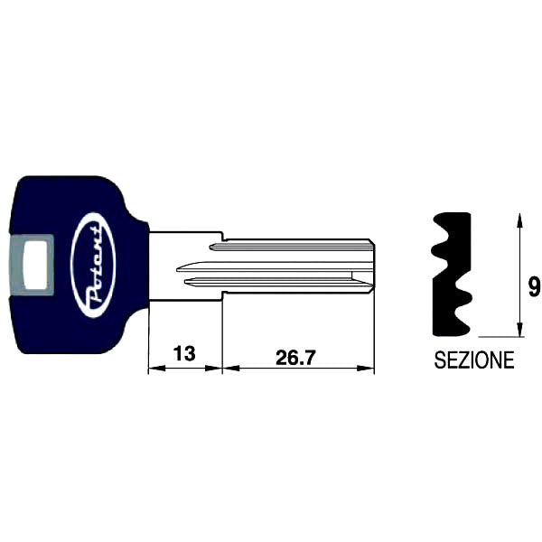 Chiave in ottone nichelatoGrezzo originale POTENTTesta plasticaCollo lungo - Reversibile - PunzonataAdatta cilindri sicurezza POTENT SECUR S3400 Per saperne di più