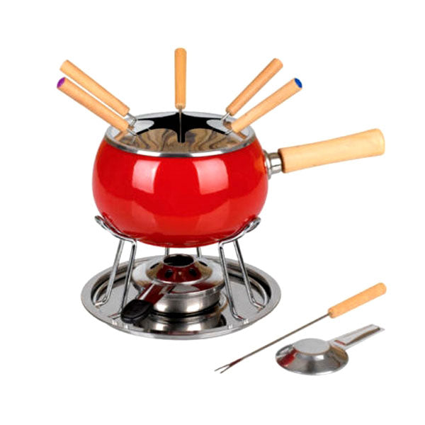 Pentolino smaltato manico legnoCoperchio paraspruzzi acciaio inoxFornello cromatoBruciatore a pasta - Sottopiatto inox6 forchettine - Ricettario Per saperne di più