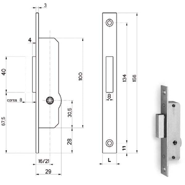 Serratura montanti alluminio da infilareZincata - CatenaccioAmbidestraScatola 29x100 - Frontale 16x156Chiave spillo KA inclusa Per saperne di più