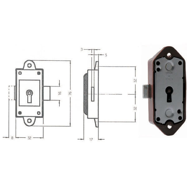 Serratura resina colore marroneApplicazione antine2 uscite chiave - Rotazione 360^Chiusura aste rotanti - Mandata mm 8,0Dimensioni mm 32x76 spessore 17,0Fornita... Per saperne di più