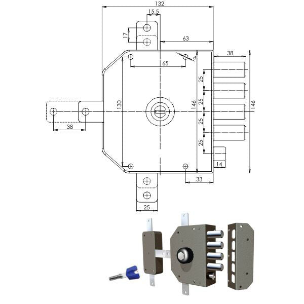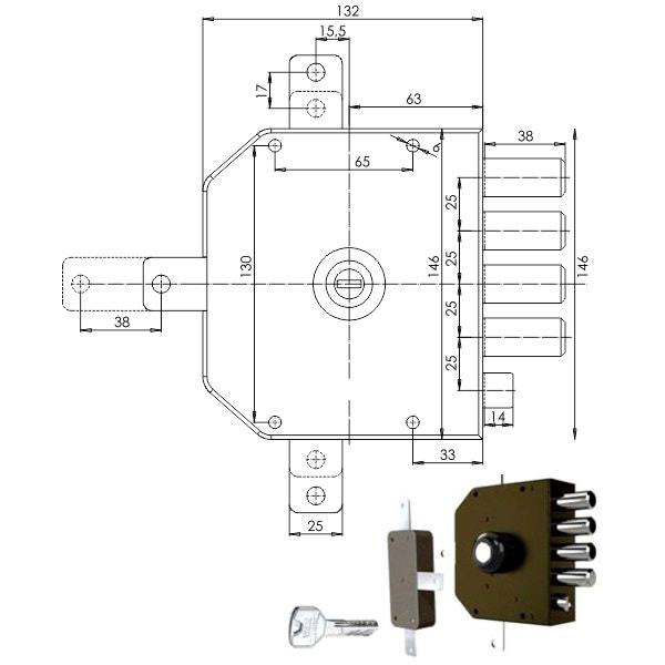 Serratura pompa applicare legno4 chiusure verticali - Pomolo internoCatenacci laterali 4 pistoni e scroccoInterasse catenacci mm 25Scatola mm 130x132x49,5 -... Per saperne di più