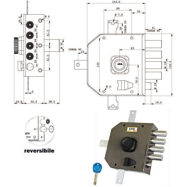 Serratura pompa chiave punzonata applicare legno4 chiusure verticali - Pomolo internoCatenacci laterali 4 pistoni e scrocco reversibileInterasse catenacci mm 26Scatola... Per saperne di più