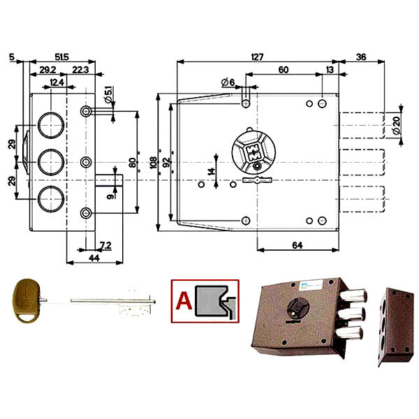 Serratura doppia mappa applicare legnoChiusura lateraleCatenacci laterali 3 pistoniMisura scatola mm 127x108x51 - Entrata mm 643 chiavi art.92106/5 Per saperne di più