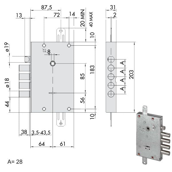 Serratura doppia mappa a planareCatenacci laterali 4 pistoni e scrocco reversibileInterasse catenacci mm 282 chiusure verticaliScatola 125x203 - Entrata mm... Per saperne di più