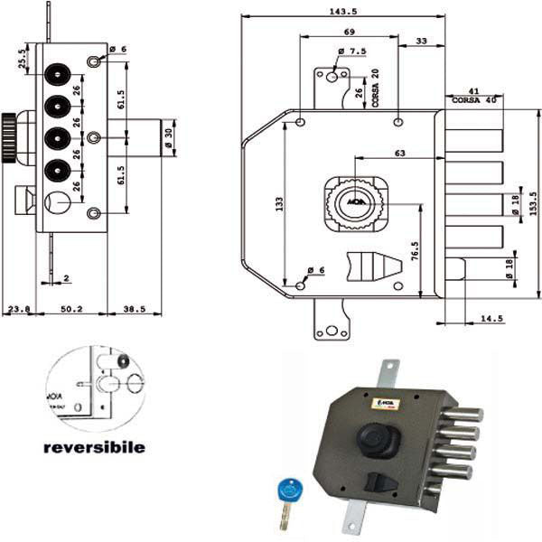 Serratura pompa chiave punzonata applicare legno2 chiusure verticali - Pomolo internoCatenacci laterali 4 pistoni e scrocco reversibileInterasse catenacci mm 26Scatola... Per saperne di più