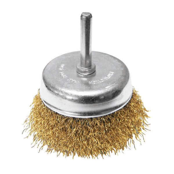 Spazzola a tazza con coduloFili acciaio ottonato ondulato mm 0,30Diametro mm 50/75Gambo mm 6 Per saperne di più